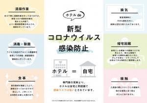 当ホテルでは、今般の新型コロナウイルス(COVID-19)による感染への対策の一環として、お客様の健康と安全並びに公衆衛生を考慮し、客室やパブリックスペースでの除菌清掃の実施、除菌用アルコールの設置、スタッフの健康と衛生面の管理徹底を行っております。当ホテルでのご滞在を安心してお過ごしいただけるよう努めてまいります。